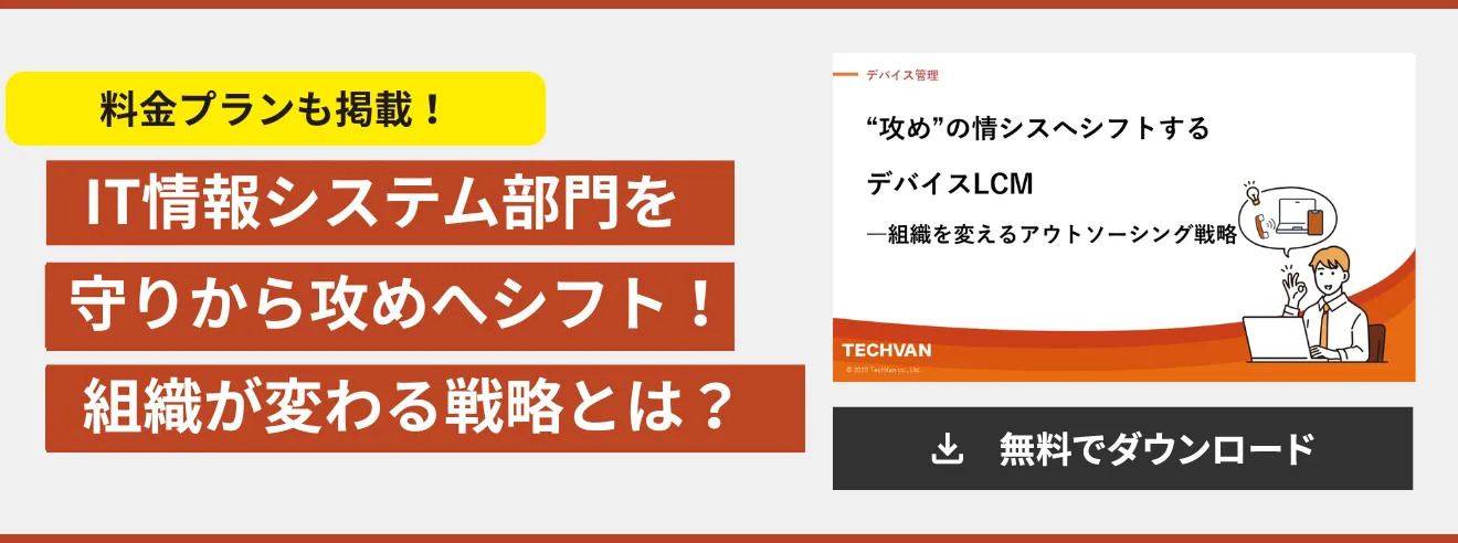 テクバンでは、MDM導入支援だけでなく、IT推進・情シス支援サービスとして、デバイス管理から運用保守、ネットワーク管理(NaaS)まで、IT環境全体を支援する総合的なサービスを提供しています。お悩みの際はお気軽にご相談ください。